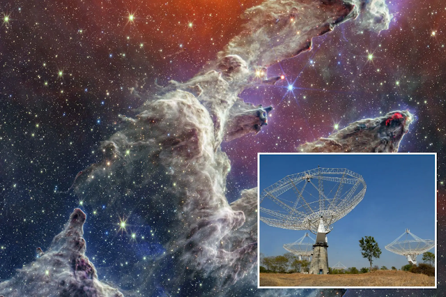 The giant radio telescope includes a field of 30 dish antennas all pointed skyward with each dish about 150 feet in diameter.